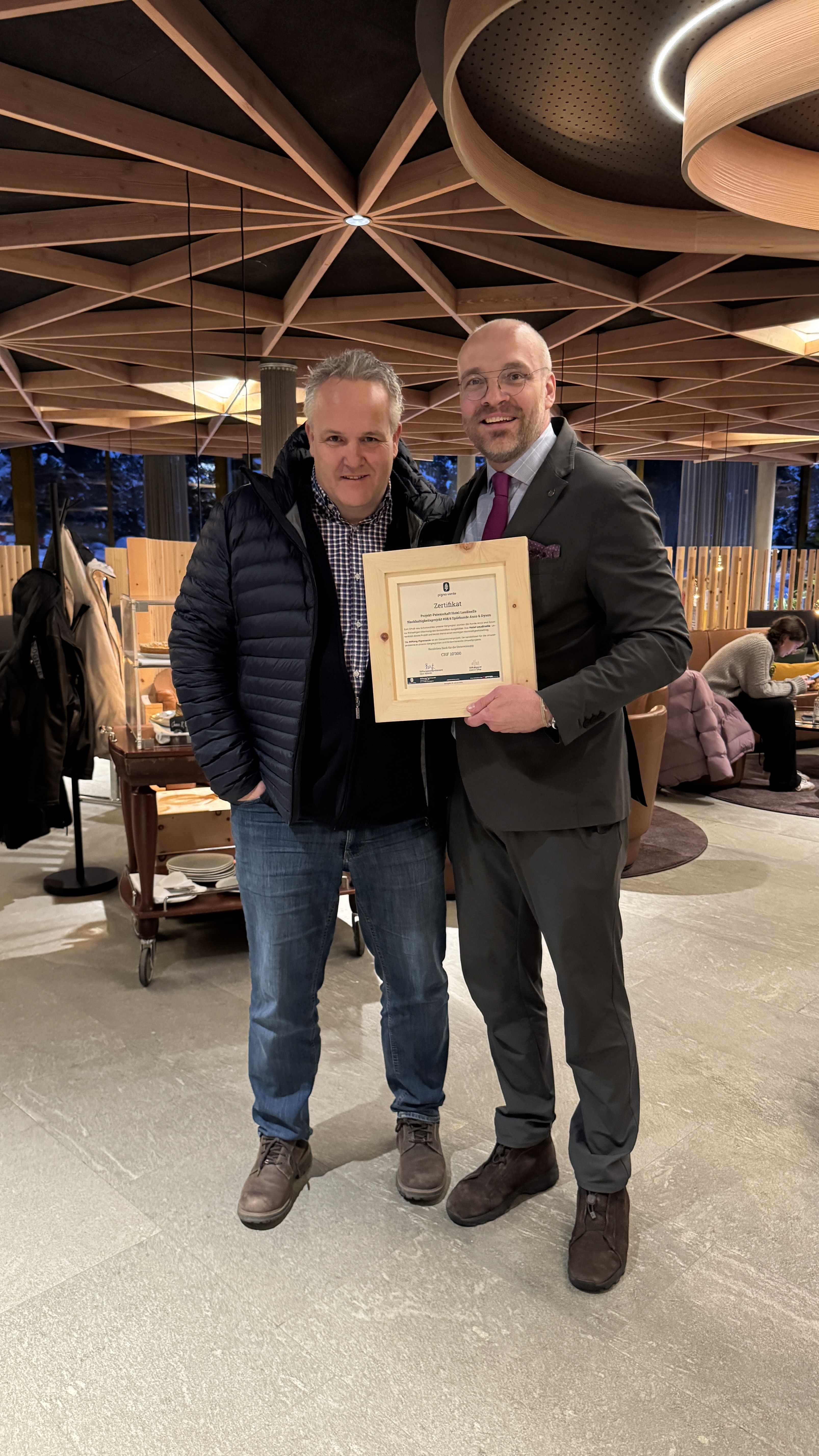 Das Engagement des Hotels ist dabei Teil einer grösseren Haltung. Im Zusammenhang mit seiner Hotelerweiterung setzte das Laudinella bewusst auf den nachhaltigen Baustoff Holz. Die Unterstützung des Projekts ist somit Ausdruck eines ganzheitlichen Verständnisses von Verantwortung: Wer mit Holz baut, übernimmt auch Verantwortung für den Wald. Mit der Projektpatenschaft möchte das Hotel dem Wald etwas zurückgeben. Es trägt damit aktiv zum Schutzwald in unserer Bergregion bei. Für dieses Engagement durften wir dem Hotel offiziell ein Zertifikat überreichen. Dieses Zertifikat ist mehr als ein Dokument. Es steht für Haltung und dafür, Nachhaltigkeit nicht nur zu kommunizieren, sondern zu leben.